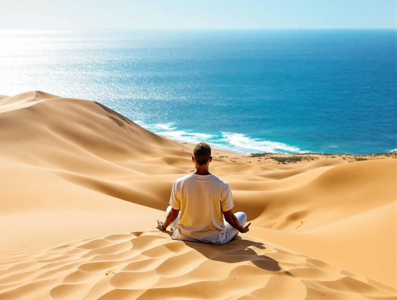 Sometimes, when anxiety grips me, I return to that image: I am sitting between the desert and the sea, and I breathe. I remember that meditation is not a technique, but a state of being. It is not controlled, it is lived. It is not learned, it is rediscovered, like finding a forgotten path.