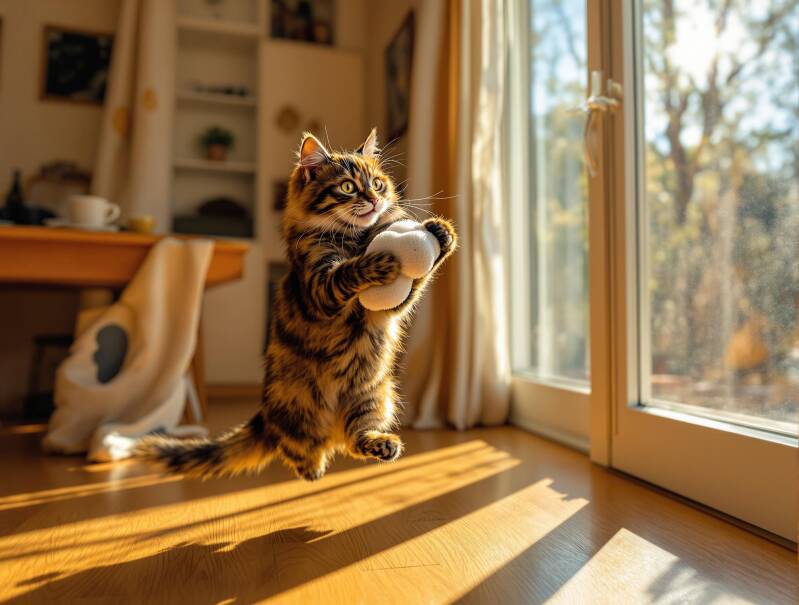 While she finished her meal, I got up to fetch her favorite stuffed toy, the little plush dog she loved to chew on and drag all over the house. The moment I pulled it from its hiding spot, she pounced toward me, tail held high, pupils wide with excitement. For two hours, we played without a care, lost in a whirlwind of laughter and wild chases. I’d throw the toy, and she’d catch it with surprising agility for a cat her size, then proudly bring it back to me, as if to say, "Again, again!" Her massive paws thudded against the floor with contagious energy, and I found myself laughing out loud, forgetting everything else. In those moments, Cassie was more than just my four-legged companion: she was my playmate, my accomplice, my pure source of joy.